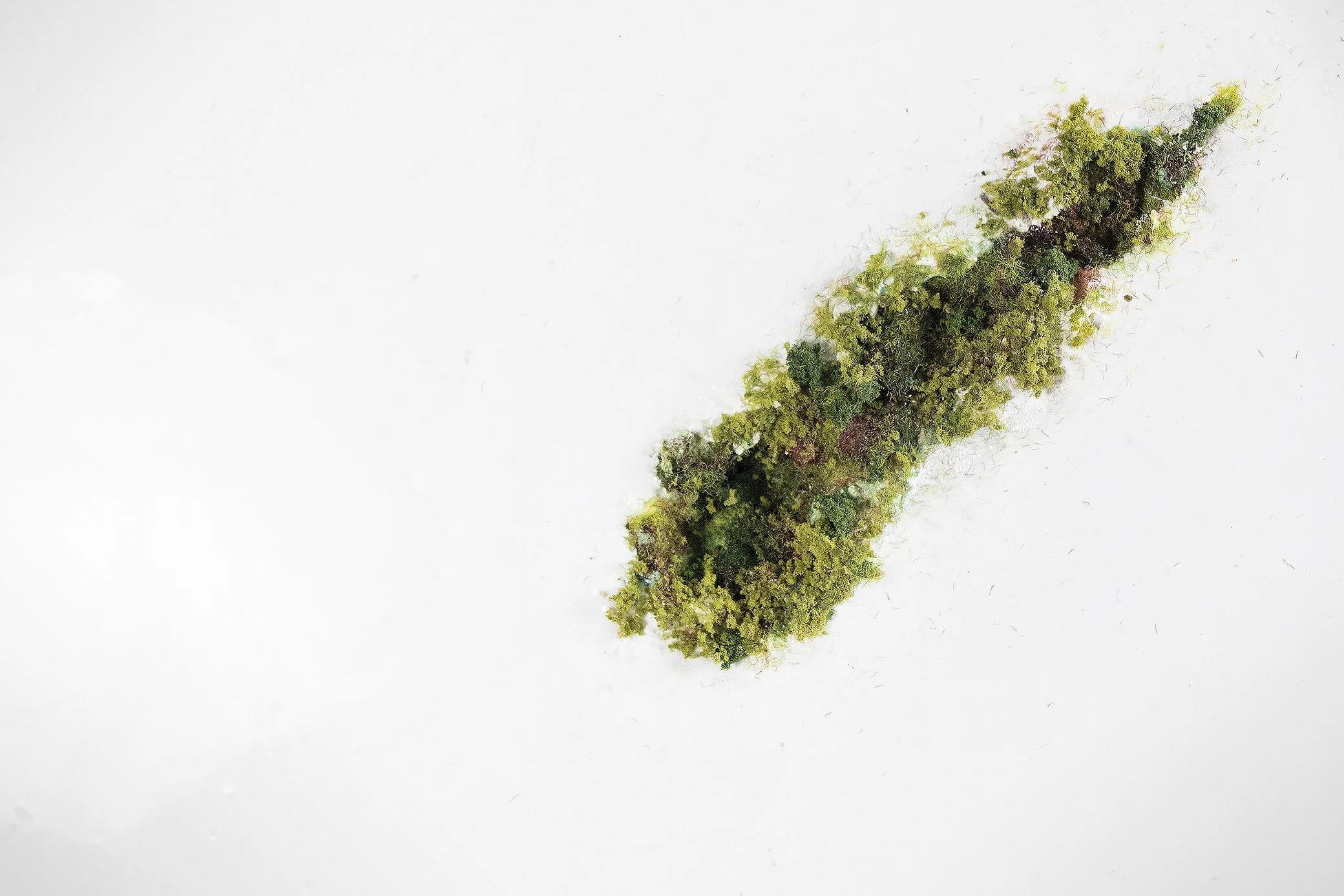 The first three from a new series of relief works that portray miniature environments and ecosystems contained within and/or breaking through, flat minimalist surfaces.