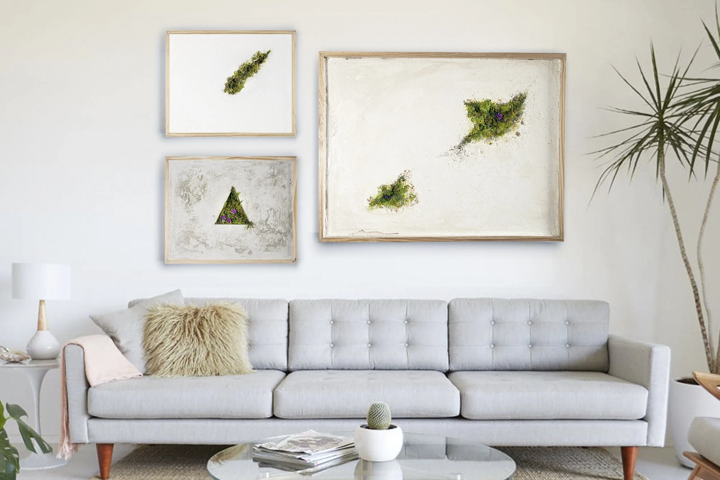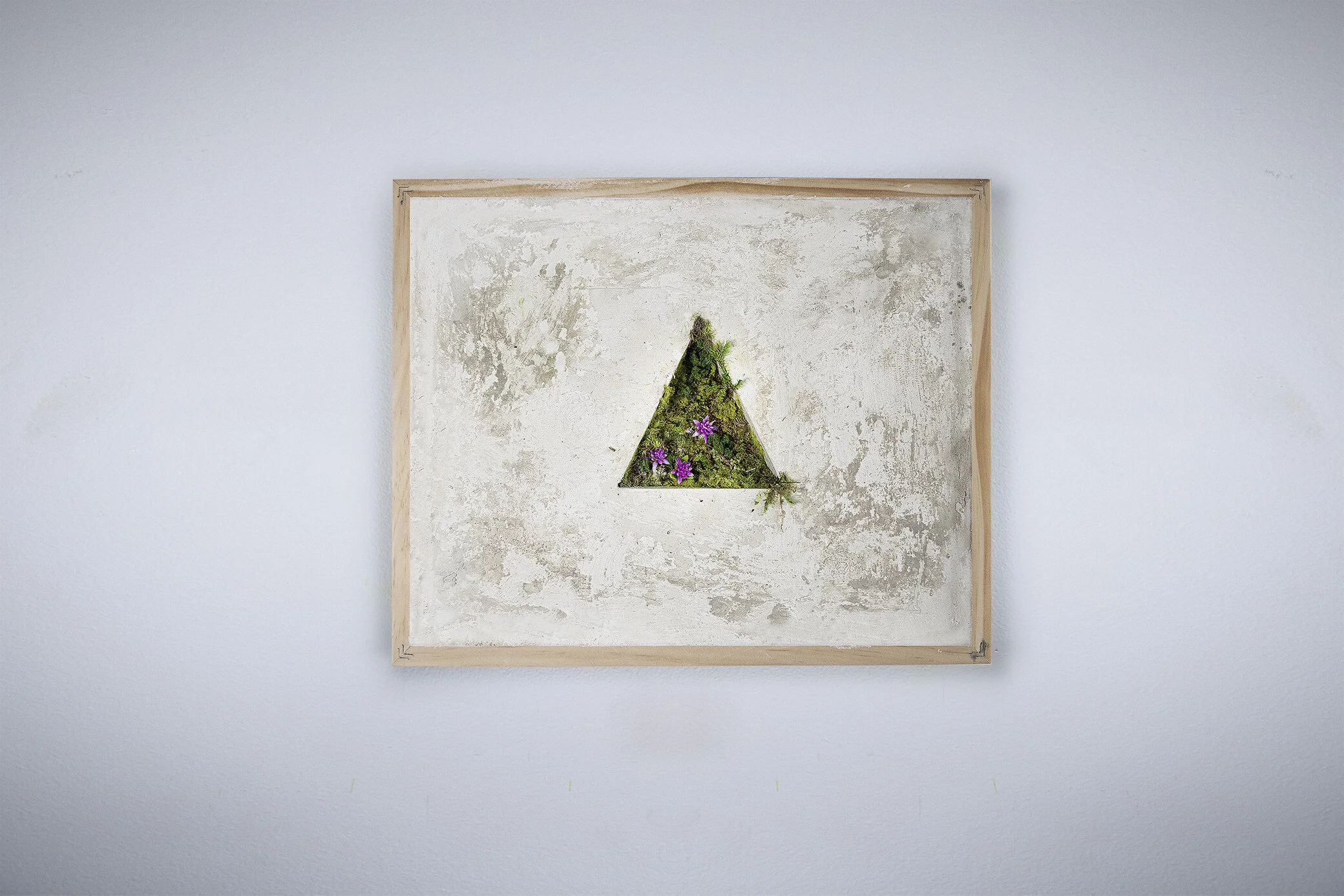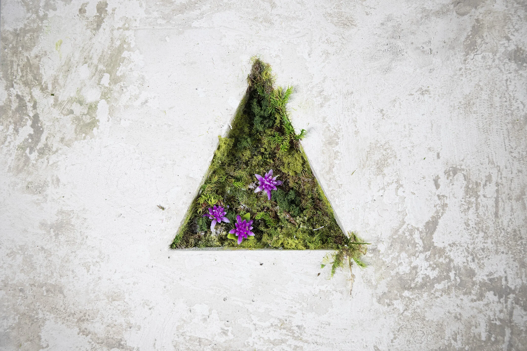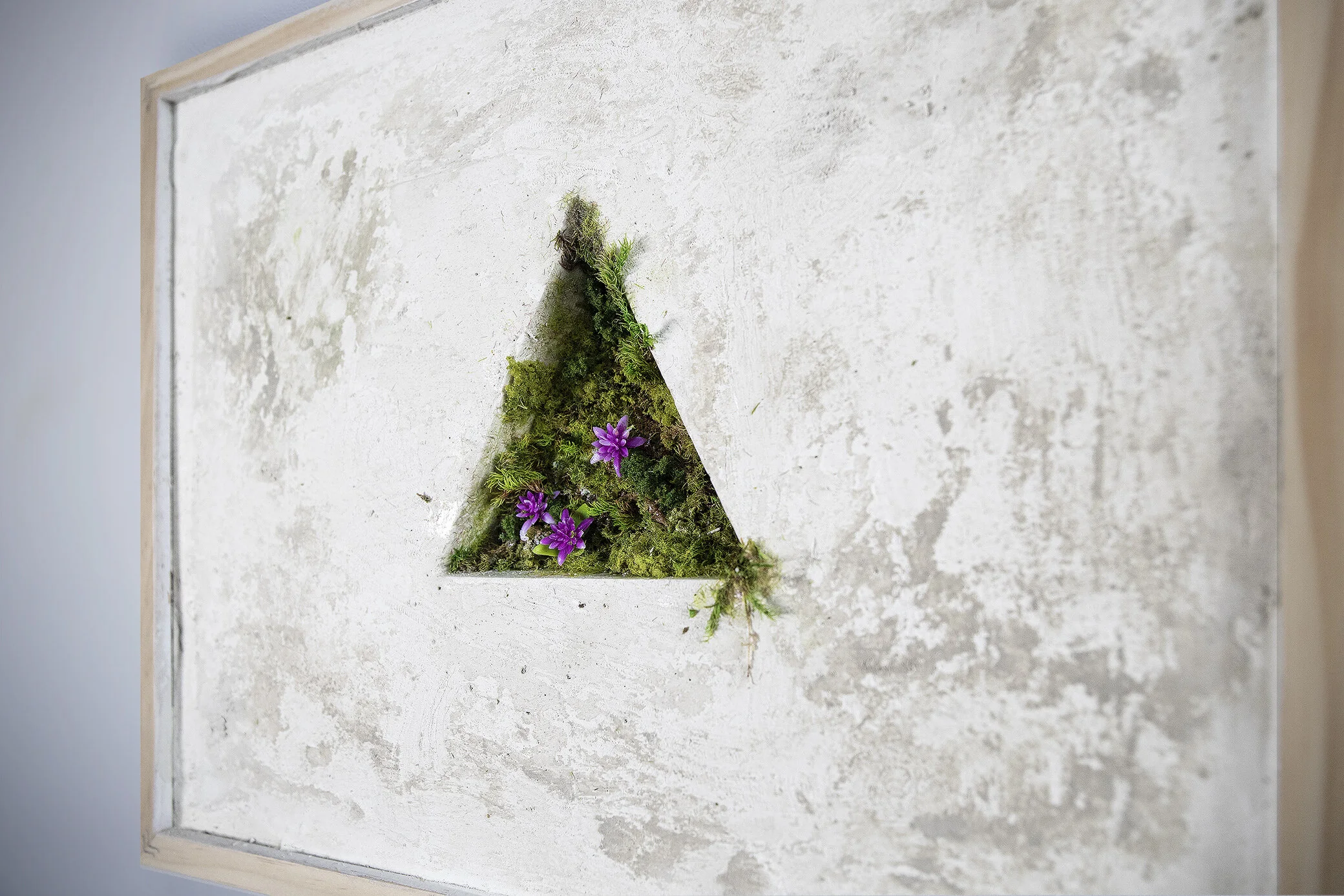 Aquaresin, cement, plaster, wood, preserved moss, artificial flowers/grass